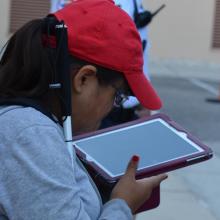 a girl in a classroom wearing headphone at a laptop using a braille display, She is smiling.